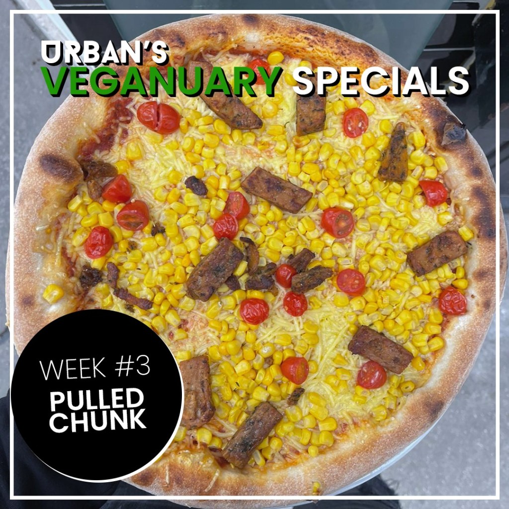 Mit Tomatensauce, veganem Schmelz, Pulled Chunks aus Erbsenprotein, Mais, Cherrytomaten